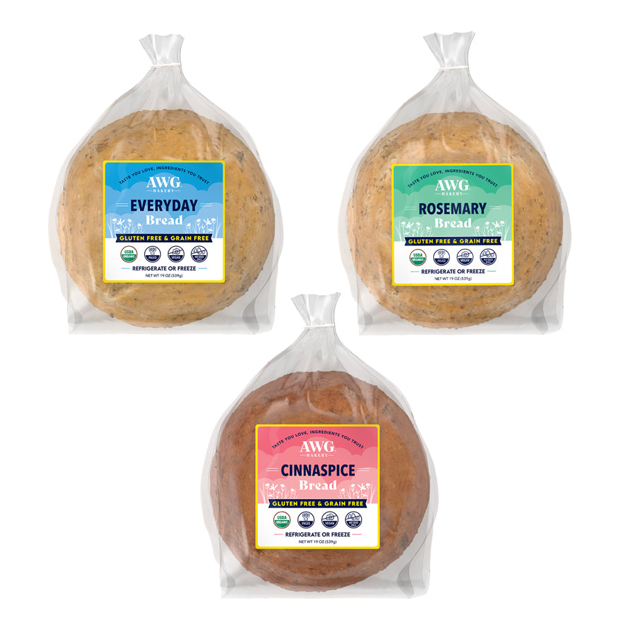 I have been searching high and low for a great gluten free bread. Living n Portland, OR I feel as though I have exhausted my search. So many made with tapioca and those often went sadly straight in the compost. One snowy day here I went on a mission to find another resource and AWG popped up first in my search! Immediately I was so excited by the ingredients and the flavors sounded amazing. I ended up the the 3 pack variety, followed the care instructions and I was good to go! I started with the rosemary bread and that was love at first bite. The perfect amount of rosemary in there and it went really well with the soup I made to go with. Just using Kerrygold butter on it was perfection. Next was the spice bread...that took me to another new level. Its so yummy in the morning with some nut butter, thinly sliced apples , a generous dash of cinnamon and a light drizzle of my local honey. I am almost through my first order and will be ordering these again plus I am so excited to try the everything bagels. So very grateful I stumbled upon your site. I am a forever loyal customer now.